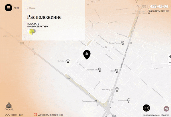 Исходя из начальной концепции: «Пользователь должен легко находить всю информацию по квартирам и дому» в разделе «Расположение» была реализована карта на основе картографических данных Google о том, какая инфраструктура располагается рядом с домом.