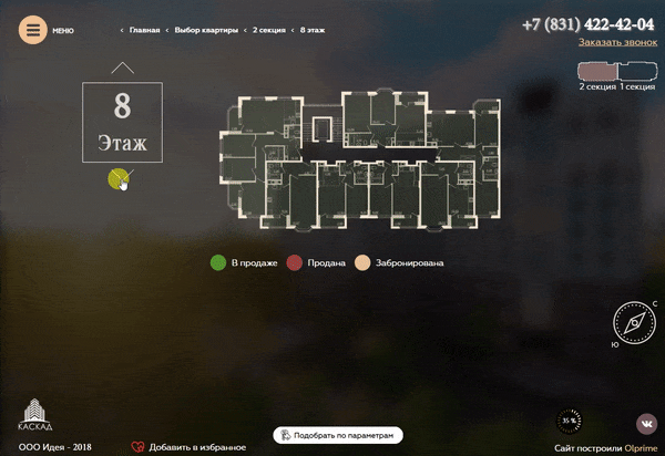 Основой для сайта стал раздел выбора квартиры. Пользователь мог следовать как «графическим путем» выбирая секцию на рендере дома, потом этаж и далее квартиру на этаже. Так и сразу же выбирать по интересующим его параметрам.