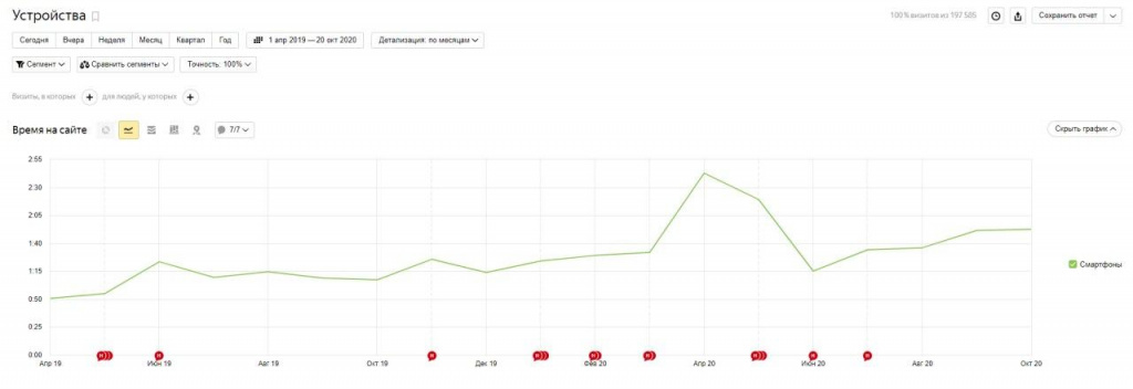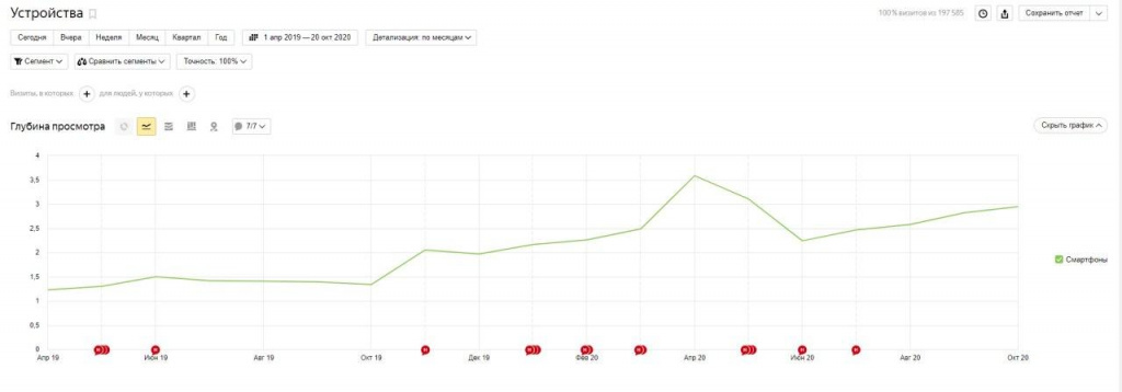 Другой показатель – глубина просмотра – увеличилась с 1,2 до 2,5 с пиком 3,6 той же весной 2020.