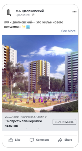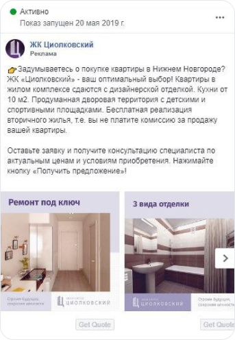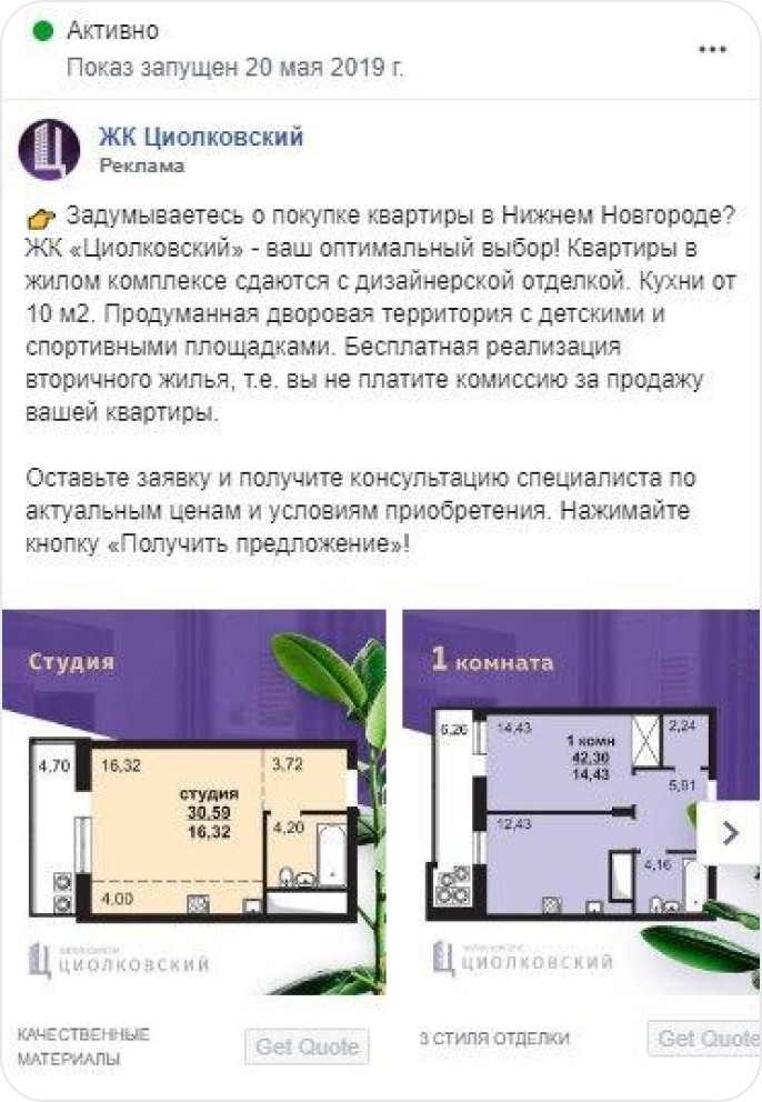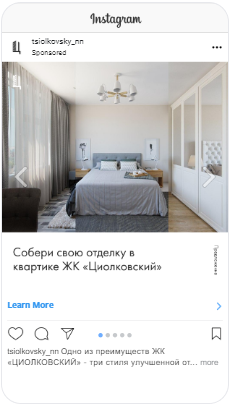 До начала работ с нами у ЖК «Циолковский» реклама в соцсетях была настроена только во ВКонтакте. В Facebook и Instagram рекламное продвижение не велось. Поэтому, чтобы повысить эффективность трафика на сайт и сформировать цену лида, мы решили полностью разработать новые РК в ВК, Instagram, Facebook и MyTarget.