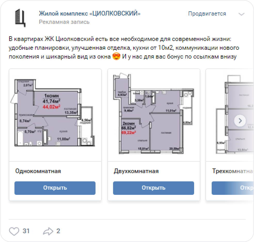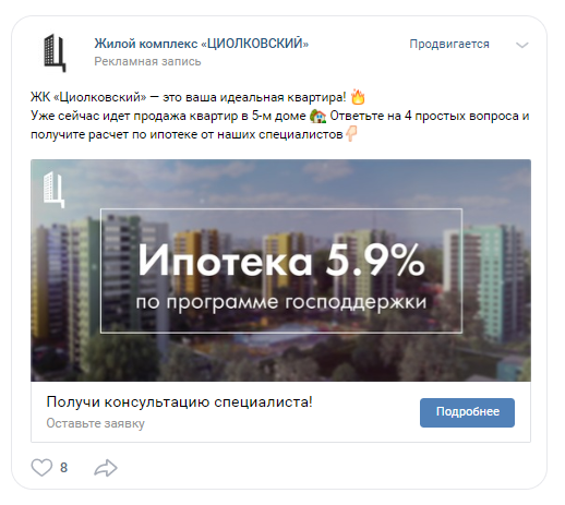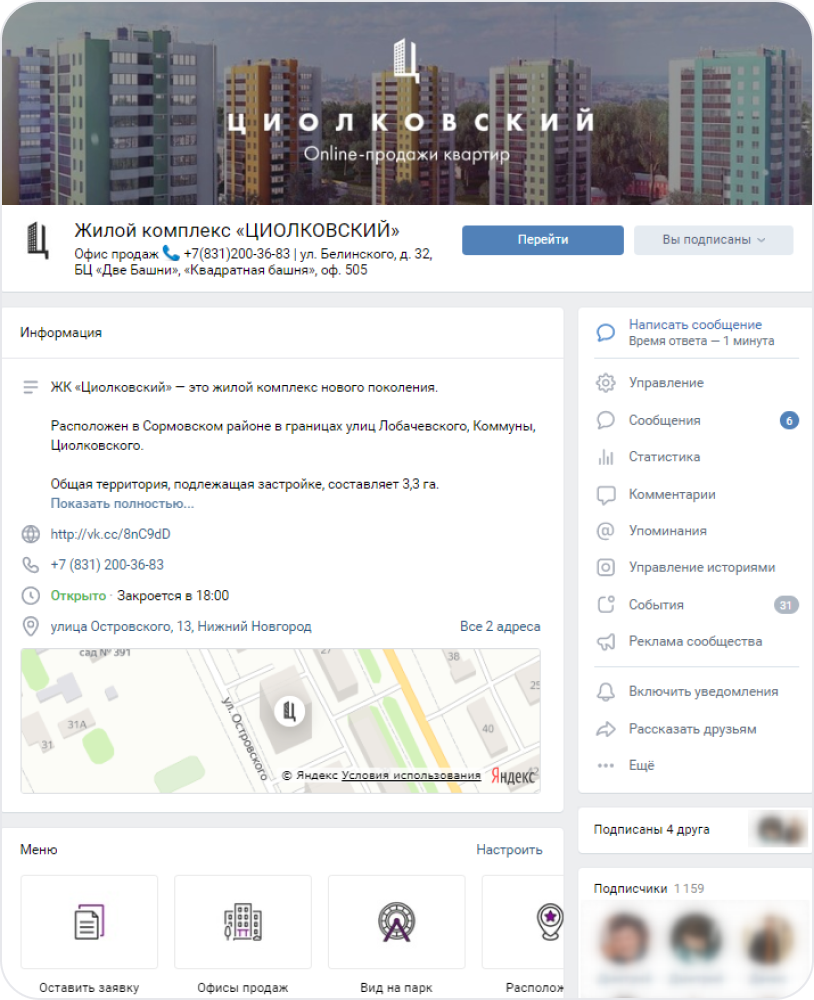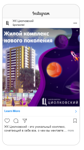 Аккаунты в социальных сетях у ЖК «Циолковский» уже стабильно работали на протяжении года. Они были упакованы в дизайне (но он был слишком невзрачным и взят из бесплатного шаблона).