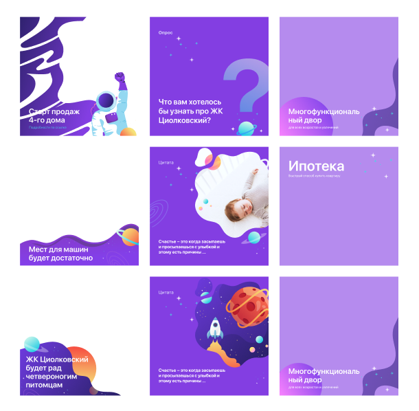 Предыдущий дизайн соцсетей не был связан с основной тематикой ЖК «Циолковский» - космосом, хотя она чётко видна в оформлении прилежащей к жилому комплексу территории. Мы решили повысить узнаваемость бренда, сделать его более позитивным и поработать над единым стилем реальных и виртуальных объектов «Циолковского». Поэтому оформление аккаунтов и постов ЖК сделали именно в космической тематике.