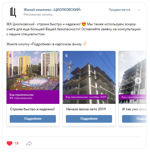 Посты с главными преимуществами и УТП ЖК «Циолковского», которые будут повторяться с некоторой периодичностью